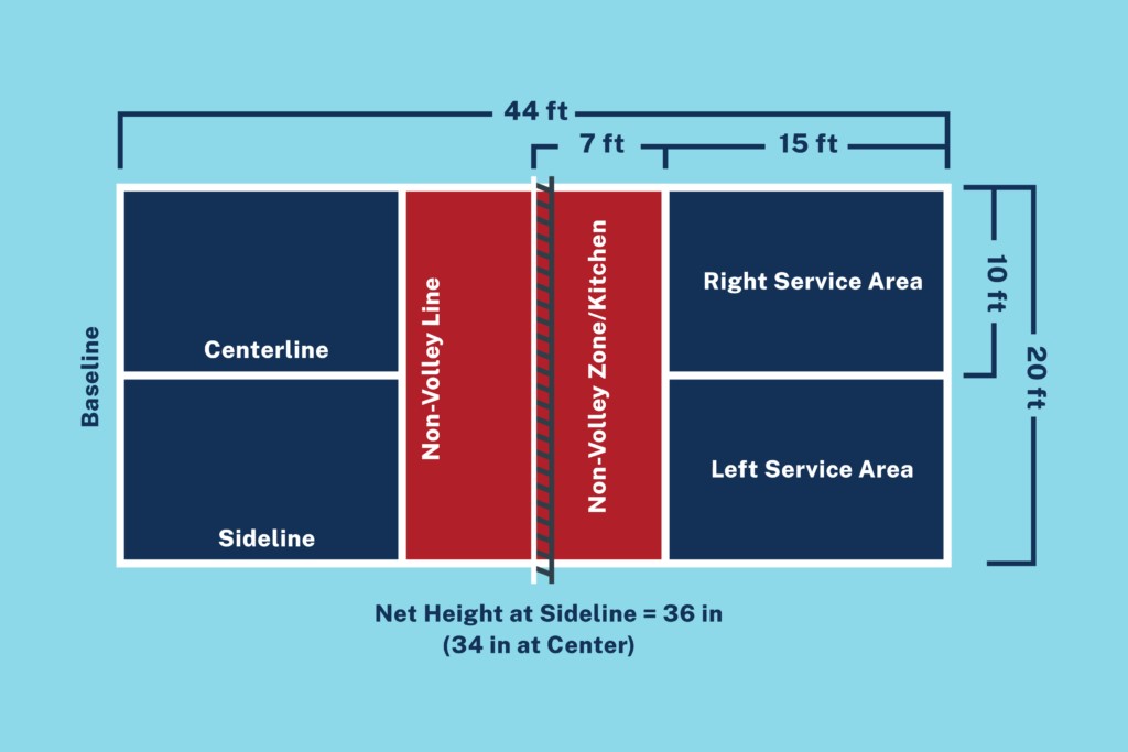 The net height is 36 inches at the sidelines and 34 inches in the middle. The court is striped similar to a tennis court with right and left service courts and a 7-foot non-volley zone in front of the net (referred to as the “kitchen”). Courts can be constructed specifically for pickleball or they can be converted using existing tennis or badminton courts.